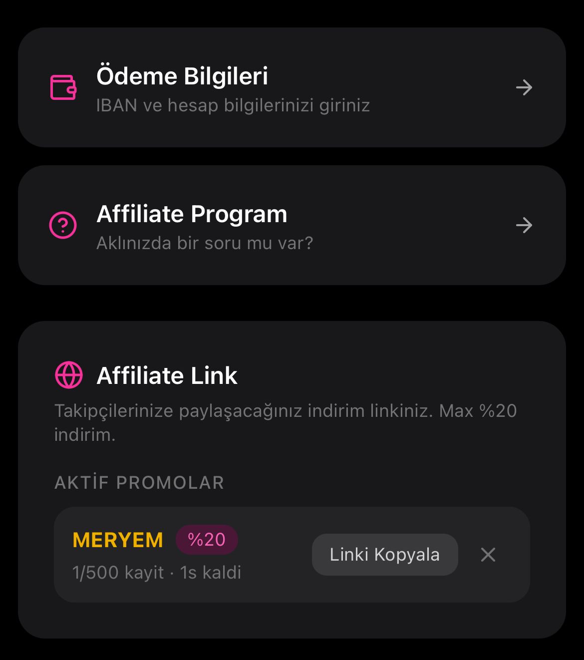 Referans linkinizi paylaşarak diğer içerik üreticilerini davet edebilirsiniz. Davet ettiğiniz affiliate her ödeme aldığında, ödeme tutarının %5'i kadar ek kazanç elde edersiniz. Bu tutar platform tarafından karşılanır, davet edilen kişinin komisyonundan kesilmez.